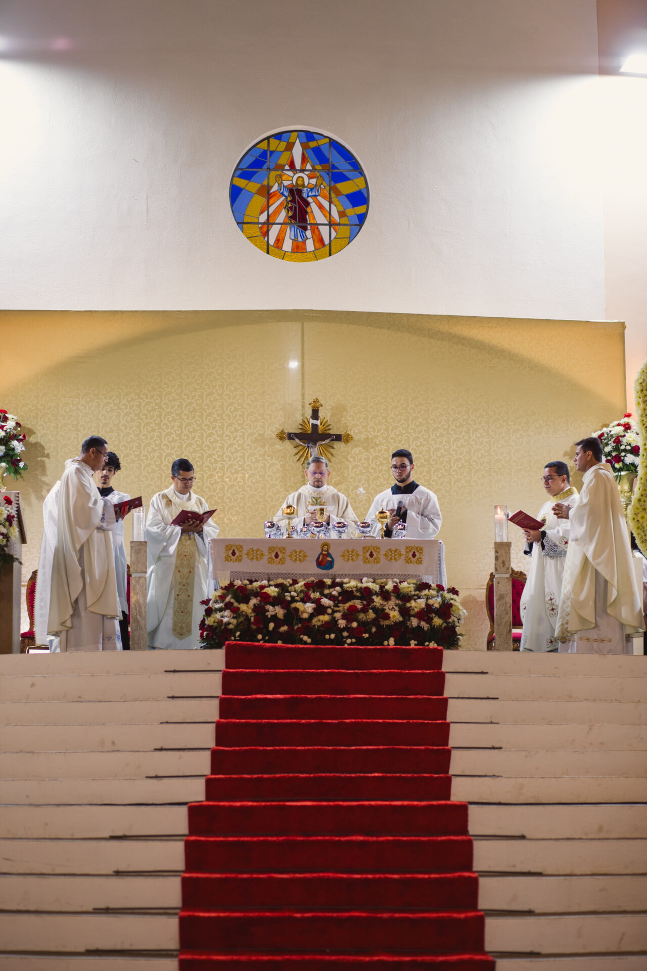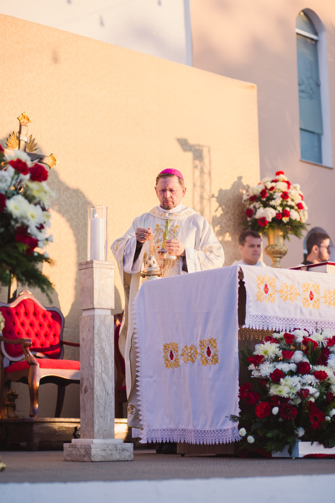 A missa solene aconteceu à s 17 horas e teve a ilustre participação de Dom LuÃs Gonzaga Pepeu, arcebispo emérito da Arquidiocese de Vitória da Conquista que presidiu a celebração, e dos concelebrantes Monsenhor Gilvan Pereira e Monsenhor Alex Adriano Babosa, vigário-geral da Diocese de Caetité, e dos padres Noé Moreira, IsaÃas Afonso Silva e Paulo Henrique Neves de Souza, pároco de Caculé. Além da participação de centenas de fieis vindos de todos os cantos da paróquia e de cidades vizinhas.