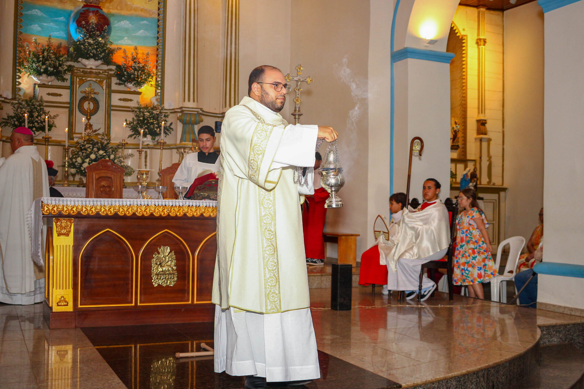 A Missa aconteceu dentro do trÃduo em honra ao Sagrado Coração de Jesus e foi realizada à s 17h, com grande participação da comunidade. A celebração foi presidida pelo Bispo Diocesano, Dom José Roberto Silva Carvalho, e contou com a presença do Monsenhor Adhemar Cardoso Neves e do pároco, Pe. Sátiro Bezerra do Prado Fernandes.