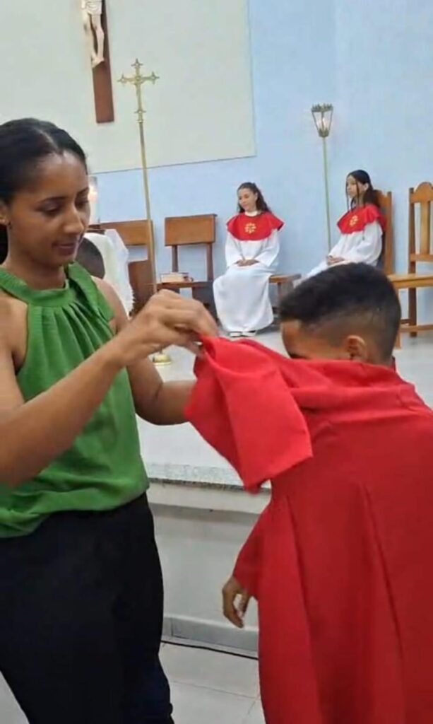 Após a homilia, eles se apresentaram diante do altar, respondendo com alegria ao chamado para servir. Receberam então das mãos dos seus pais as vestes próprias dos coroinhas, que recorda o avental usado por Jesus ao lavar os pés dos discípulos, símbolo do serviço humilde e generoso.