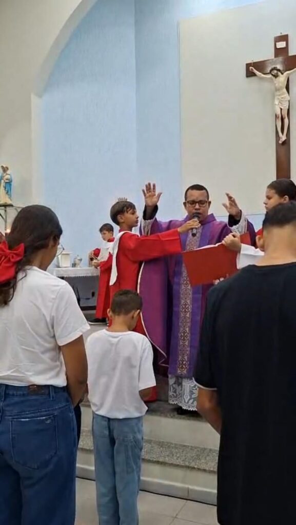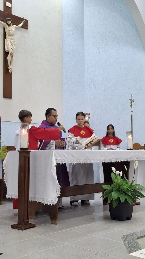 Em seguida, em um gesto simbólico, estenderam a mão direita para o altar e rezaram juntos, renovando sua promessa de amor, obediência e perseverança no serviço litúrgico. Esse momento de renovação fortaleceu ainda mais o vínculo da comunidade com os coroinhas, que com simplicidade e entrega ajudam a tornar as celebrações mais belas e participativas.
